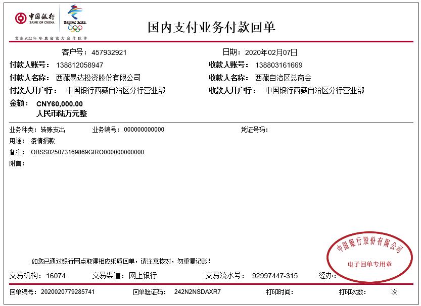 疫情就是命令,防控就是责任。易达集团党委带领集团,通过“延、查、捐”三方面举措,严格布置,全面防控。首先,推迟集团员工复工时间。根据国家对新型冠状病毒感染肺炎疫情防控工作的要求,为有效减少人员聚集、阻断疫情传播,结合国家及区工商联的倡议,推迟西藏公司、尼泊尔公司和成都公司员工复工时间。其次,深入调查职工信息,做好职工跟踪关怀。根据疫情防控要求,集团党委对职工春节期间出行信息及身体状况进行统计,各支部发扬先进作风,通过在线工作群全面做好疫情防控宣传,疏导职工情绪,建立信心,积极做好职工关怀跟踪。同时集团发扬“一方有难,八方支援”的协作精神,积极履行社会责任,组织全员捐款,为疫情防控工作贡献全部力量。2020年1月27日,集团旗下西藏易境旅游景观规划设计公司向湖北省红十字会捐赠5万元; 2020年2月7日,西藏易达投资股份有限公司向西藏自治区总商会捐赠6万元;截止目前公司抗击疫情捐款共计11万元。