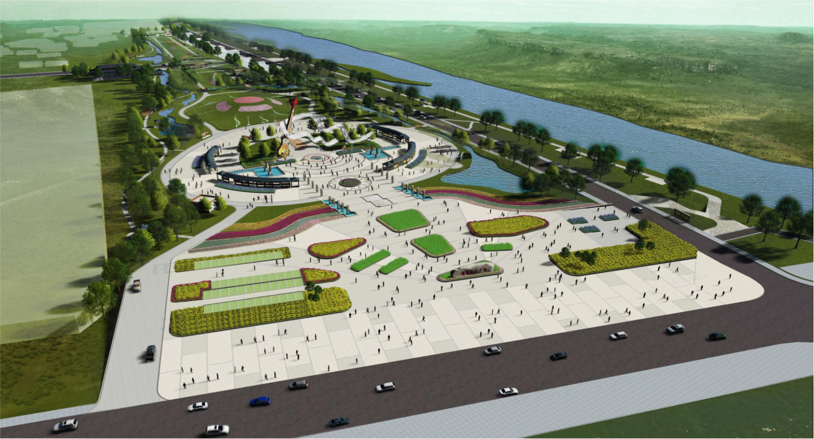 项目一方面充分利用现状河流,将水系引入并贯穿整个广场,使其灵动起来。步行观光系统依托水系进行打造,将项目内的景观节点进行串连。另一方面,项目继承和发展了理性主义庄重典雅、精致大方的原则。采用象征主义的设计手法,形式与结构相统一。创造出“大气、自然、独具个性”的建筑风格,符合保护与利用结合的初衷,确保区域休闲旅游的可持续发展,成为区域旅游及市民景观的亮点。
