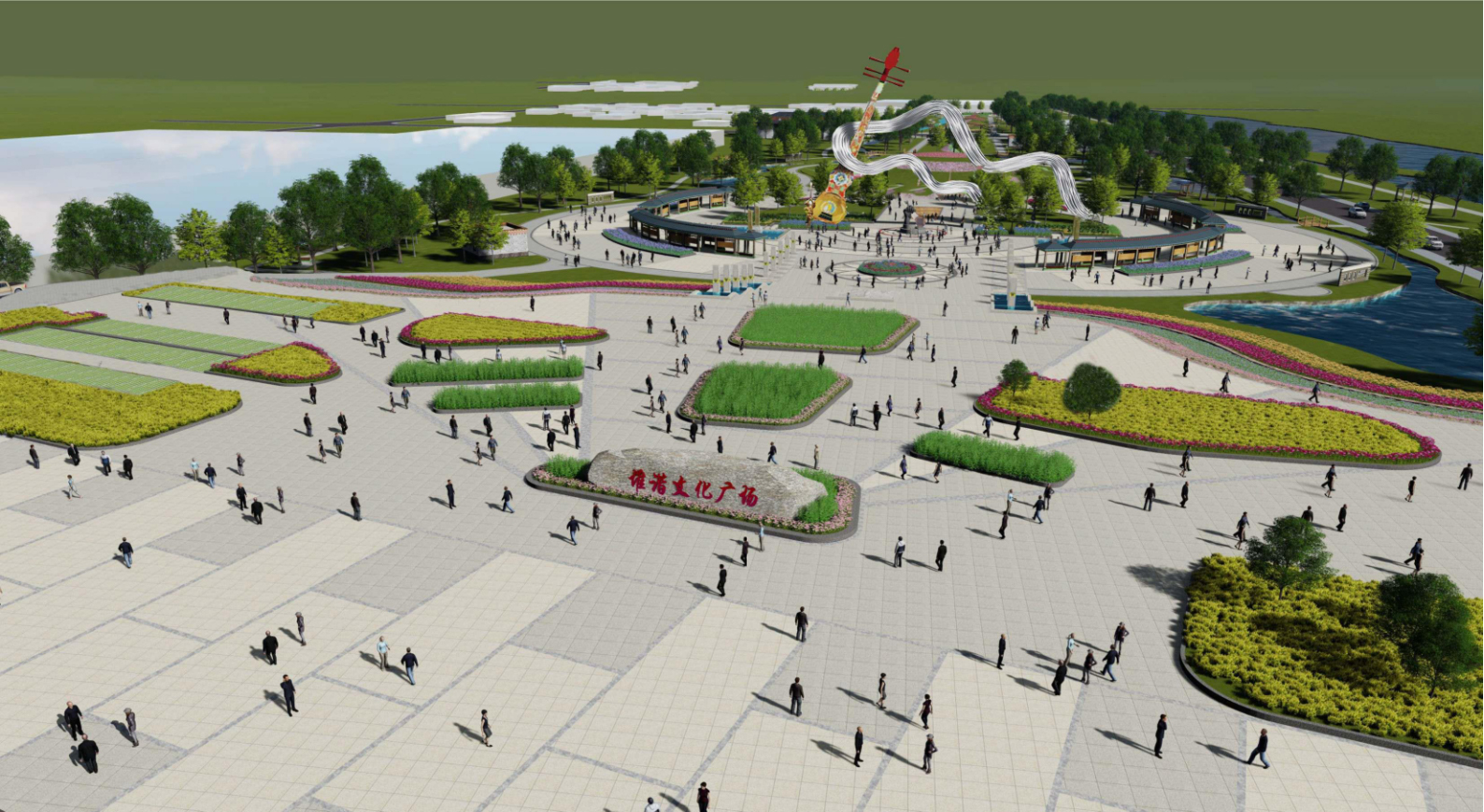 接下来便是整个广场的核心景观区域。设置有水景广场、台阶看台,以便于进行堆谐文化演艺,向游客以及当地市民宣传堆谐文化。借用雕塑小品、休息长廊、特色景观柱等景观小品的设置,丰富和提升了片区的景观环境。广场中心是巨大的堆谐歌舞伴奏乐器六弦琴雕塑,它不仅是表达广场主题的载体,更是艺术家表达思想的一种表达方式。古朴绚丽的琴身,配上飘逸的音浪造型,活泼灵动。雕塑周边环绕着木制景观廊架,供人们休息停留。